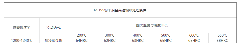 MH55粉末冶金高速鋼耐磨性和韌性方面比較均衡,屬于鉬系高碳含鈷超硬型高速工具鋼,硬度高,可達(dá)65HRC,熱硬性好,高溫硬度高,容易磨削。用該鋼制造的切削工具,可以切削鐵基高溫合金、鑄造高溫合金、鈦合金和超高強(qiáng)度鋼等,但韌性稍差,淬火時(shí)溫度應(yīng)采用下限。由于可磨削性能好,所以可用來(lái)制造各種高精度復(fù)雜刀具。